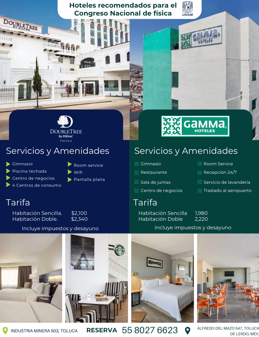 Información detallada de hoteles para el LXVIII Congreso Nacional de Física 2025 en Toluca